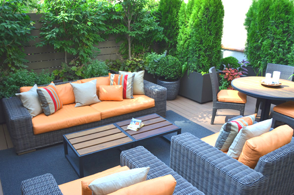 Initially falling apart, this Chelsea terrace was completely gutted. Old wooden deck panels were replaced with maintenance-free aluminum decking. An outdoor TV and bio-ethanol fireplace found a home in custom-built cabinetry.