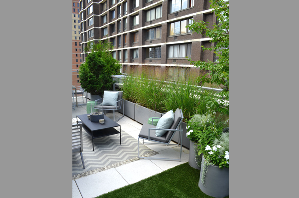 Specimen evergreens were used for year round interest since the apartment has a solid wall of windows facing the terrace.