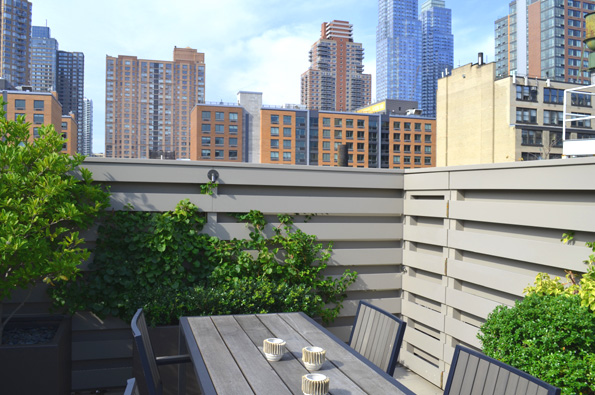 Formerly a blank slate of concrete and chain-link fence, this penthouse garden now offers multiple areas to enjoy the surrounding view of mid-town Manhattan.