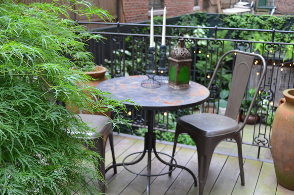Reclaimed barn doors add a focal point to the east wall while a custom built two-tier green screen trellis allows vines to fill this garden which spans two floors of the client's home.