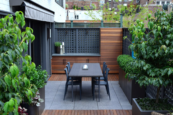 Surrounded in lattice, our goal for this terrace was to reuse existing elements while altering the flooring to make it feel updated and reflect the finishes on the interior of the apartment.