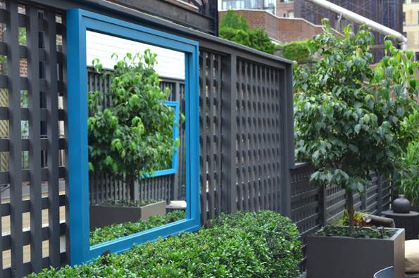 We installed ipe tiles along with striated porcelain tiles to change the feel of the flooring. Custom mirrors in a teal finish add focal points in the garden and help to make the space feel wider than it is.