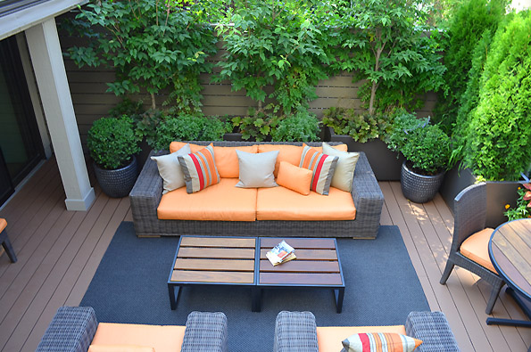 Modern fencing adds privacy to the space along with a tall evergreen hedge. An automatic awning covers the space to allow for protection from the elements while enjoying movies, or having a party.