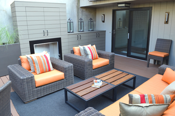 Initially falling apart, this Chelsea terrace was completely gutted. Old wooden deck panels were replaced with maintenance-free aluminum decking. An outdoor TV and bio-ethanol fireplace found a home in custom-built cabinetry.
