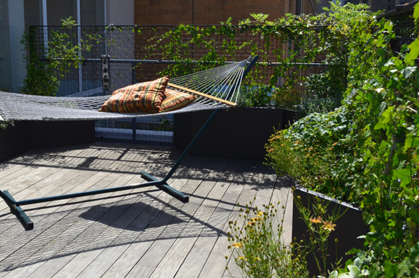 Images 12345678 Green screen lattice panels are the main feature of this private rooftop. Decking and a grass lawn are surrounded by the trellis which is interplanted with flowering deciduous and evergreen vines to create a relaxed feel in the space.C