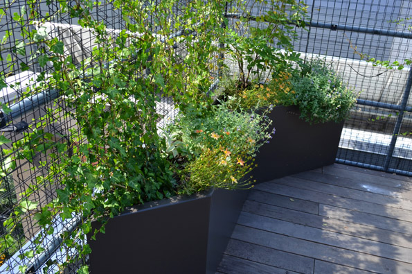 Images 12345678 Green screen lattice panels are the main feature of this private rooftop. Decking and a grass lawn are surrounded by the trellis which is interplanted with flowering deciduous and evergreen vines to create a relaxed feel in the space.C