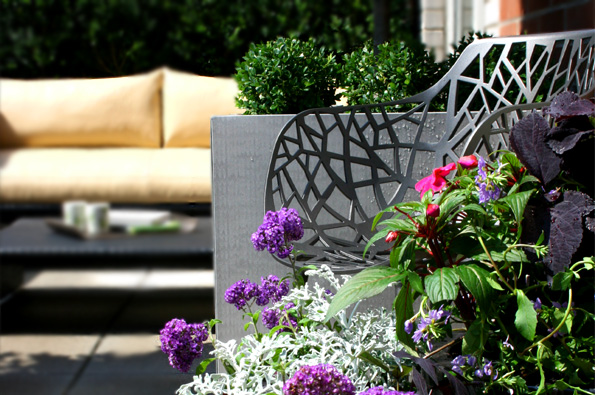 A summer planting on this terrace features understated hues of purple with a splash of pink. Accent planters serve as focal points in this garden and are a great place to use more colorful plant materials.