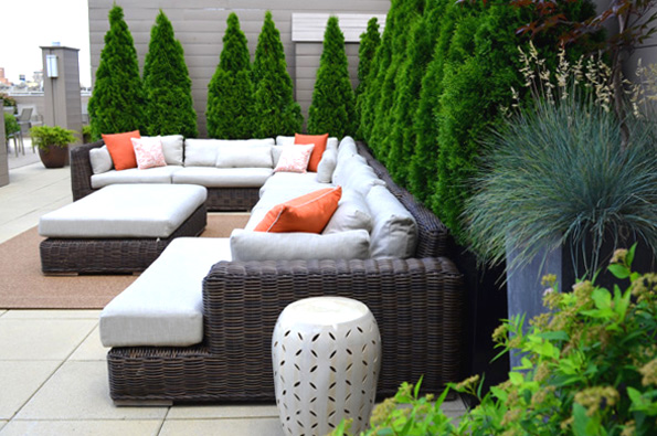 In addition to a new furniture layout to coordinate with the interior rooms and furnishings, we added seating, planters and accessories to complete the garden. Flowering shrubs soften the dining area, while columnar evergreens set the backdrop for the sectional sofa.
