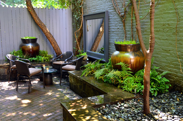The planting beds were divided between beach pebbles and native woodland perennials to add texture and depth to the space. Complete with accent lighting on the planters and a new pendent fixture in the pergola, the garden comes to life at night.
