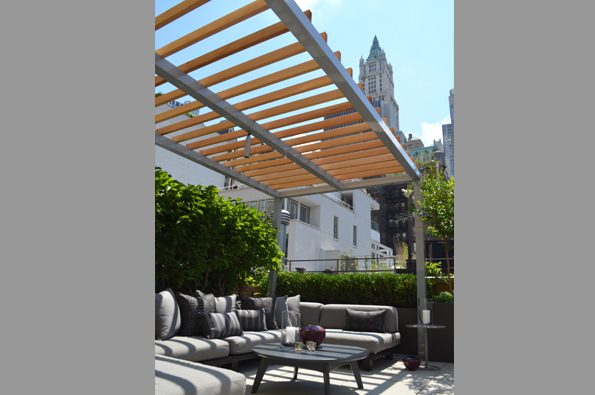 With views to the Freedom Tower, this penthouse garden now features a custom pergola made from powder-coated aluminum and cedar slats. The pergola serves as a strong architectural statement in the space and provides shade to the luxurious sitting area below. Multi-stem trees and shrubs help to provide "walls" around the pergola.